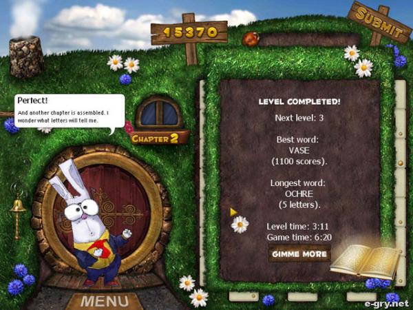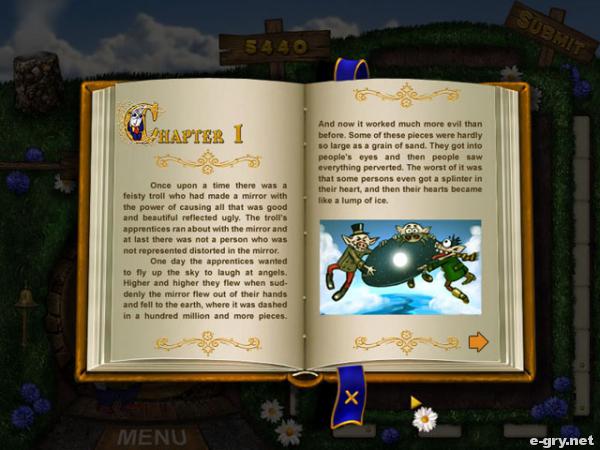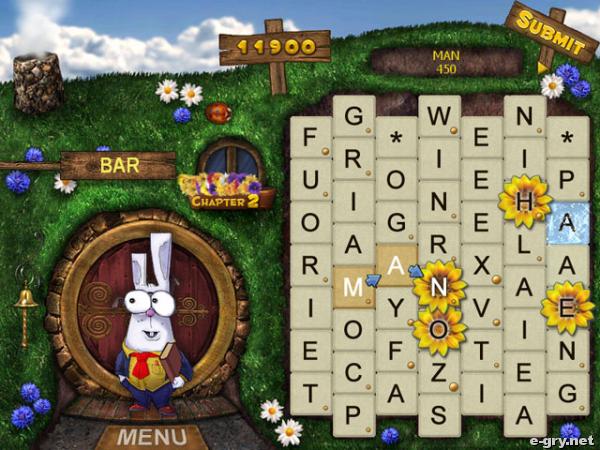 Pewnie każdy z nas zna baśń o złej \"Królowej Śniegu\". Sympatyczny Królik postanowił się z tą historią zapoznać. Traf chciał, że zwierzak trafił na egzemplarz znajdujący się poza zasięgiem jego łapek. W momencie, gdy już już go miał, ruszył książką tak niefortunnie, że wszystkie literki z niej wypadły! Co teraz? Królik musi ruszyć w ślad za nimi, pozbierać wszystkie, ułożyć kolejno w odpowiednie wyrazy i poznać baśń. Masz do wyboru 2 rodzaje gry, prócz tego wszelkie wyjaśnienia i pomoc na bieżąco, podświetlane odpowiednie litery na planszy. Niesamowita wciągająca gierka, pełna dodatkowo wzrotów akcji, bo jednak nie każda literka jest dobra i pasuje do zawartości książki. Były kiedyś takie, które w większych ilościach składały się na tajemnicze, negatywne zaklęcia. Czekają one tylko na to, by zrujnować cały świat. Ale Królik, z twoją pomocą na pewno sobie poradzi, pokona je i dowie się, jak potoczyła się akcja w wyżej wspomnianej baśni!