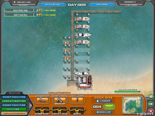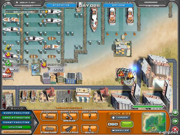 Bardzo ciekawa gra symulacyjna, w której masz okazję zacząć karierę jako projektant najlepszej w mieście przystani. Musisz się bardzo postarać, a później zostanie ci tylko liczenie zysków. Jednak, zanim to nastąpi, zastanów się, jak chcesz, by to całe przedsięwzięcie wyglądało. Musisz postawić restauracje, hotele, co rusz budowań nowy dom. Czeka cię wiele pracy, by zadowoleni klienci zostawili dużo pieniędzy, które ty wykorzystać na kolejne przedsięwzięcia.