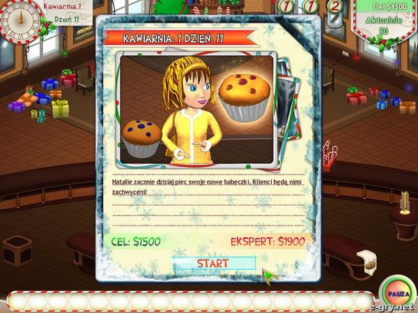Amelia ma nie lada problem, bo święta się zbliżają. Kilka jej kawiarni trzeba udekorować, by klienci czuli klimat nadchodzących świąt, a tu jeszcze trzeba dbać o interes. Ale czy to właśnie nie nadmiar obowiązków czyni tą grę tak ekscytującą? Sprawdź się osobiście, czy zdołasz udźwignąć trudy przedświątecznej gorączki, zająć się dobrze ludźmi i uzbierać dość pieniędzy, by twoje kawiarnie mogły dobrze działać? Przekonaj się już teraz.